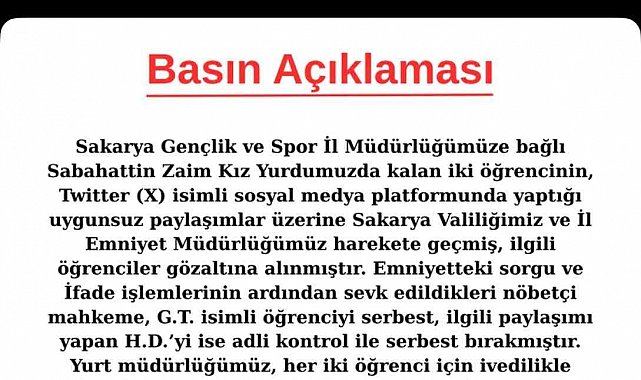 Öte yandan Gençlik ve Spor İl Müdürlüğü, kızların soruşturma süresi boyunca yurttan uzaklaştırıldığını duyurdu. Yapılan paylaşımda, "Sakarya Gençlik ve Spor İl Müdürlüğümüze bağlı Sabahattin Zaim Kız Yurdumuzda kalan iki öğrencinin sosyal medya platformunda yaptığı uygunsuz paylaşımlar üzerine Sakarya Valiliğimiz ve İl Emniyet Müdürlüğümüz harekete geçmiş, ilgili öğrenciler gözaltına alınmıştır. Emniyetteki sorgu ve ifade işlemlerinin ardından sevk edildikleri nöbetçi mahkeme, G.T. isimli öğrenciyi serbest, ilgili paylaşımı yapan H.D.'yi ise adli kontrolle serbest bırakmıştır. Yurt müdürlüğümüz, her iki öğrenci için ivedilikle disiplin soruşturması başlatmış ve Yurt Hizmetleri Yönetmeliği'nin 24/3 maddesine göre de öğrencilere soruşturma süreci boyunca yurttan uzaklaştırma cezası verilmiştir" ifadeleri yer aldı.
