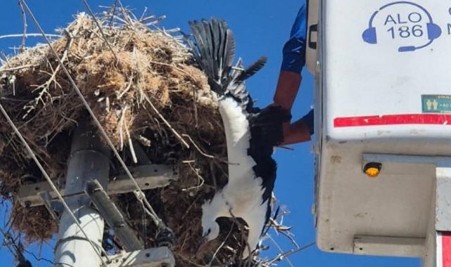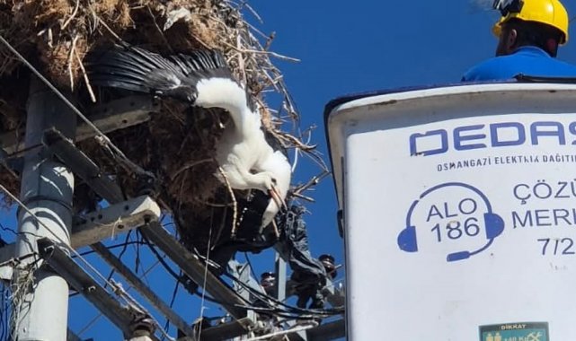 Afyonkarahisar'da elektrik direğinde leylek yaptığı yuvaya takılı kalınca devreye giren Osmangazi Elektrik Dağıtım A.Ş. (OEDAŞ) ekipleri tarafından kurtarıldı.