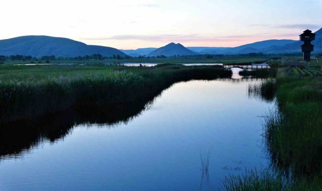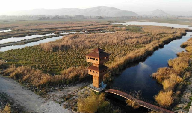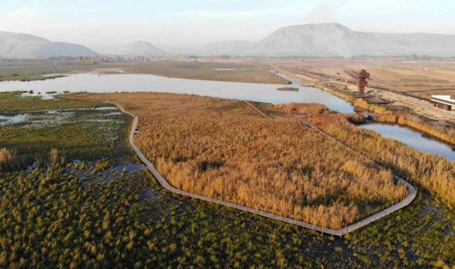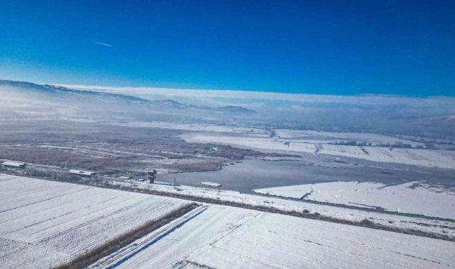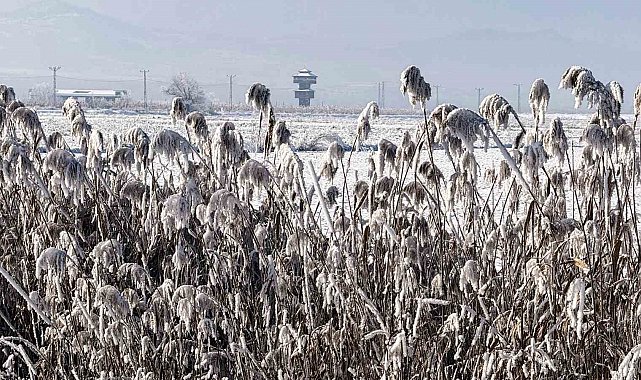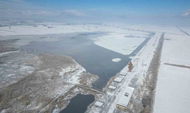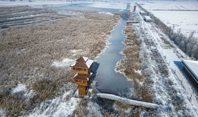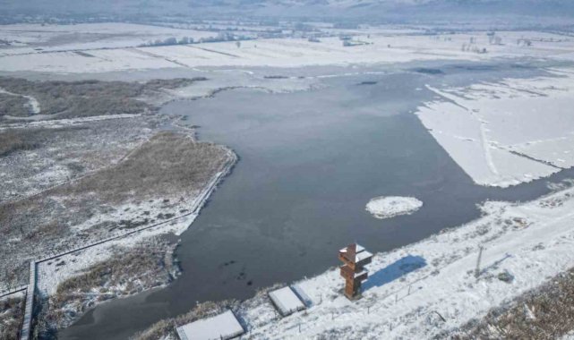 Kar yağışı sonrası sazlık alanları, yürüyüş yolları ve gözetleme kuleleriyle dikkat çeken Kaz Gölü, kış mevsiminin tüm güzelliğini gözler önüne serdi. Beyaz örtüyle kaplanan göl ve çevresi yağlı tabloları andıran görseller oluşturdu.