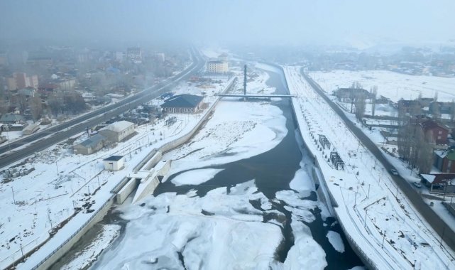 Kışın en sert geçtiği illerden biri olan Ağrı'da bir süredir etkisini gösteren soğuk hava nedeniyle kentte hayat durma noktasına geldi. Sis ve buzla kaplanan Murat Nehri dronla görüntülendi. Ortaya eşsiz bir manzara çıktı.