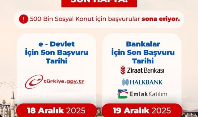 Toplu Konut ve Kamu Ortaklığı İdaresi Başkanlığı'ndan (TOKİ) yapılan açıklamaya göre 500 bin sosyal konut için başvuru tarihlerinin e-Devlet için 18 Aralık, banka aracılığıyla yapılan başvuruların ise 19 Aralık'ta sona ereceği açıklandı.