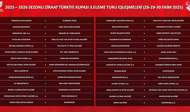 Ziraat Türkiye Kupası'nda 3. eleme turu maçları; 28-29-30 Ekim tarihlerinde oynanacak. Eşleşmelerde kazanan taraf, 4. tura yükselmeye hak kazanacak.