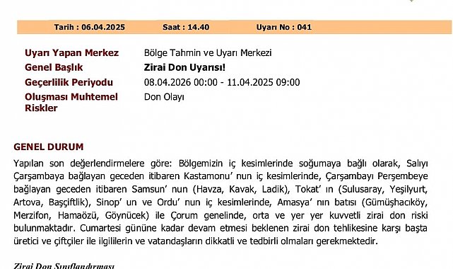 MGM Bölge Tahmin ve Uyarı Merkezi tarafından yayımlanan uyarıda, 8 Nisan gece saatlerinden itibaren başlayıp 11 Nisan sabahına kadar sürmesi beklenen don olayının, özellikle iç kesimlerde etkili olacağı bildirildi. Açıklamada, Kastamonu, Tokat, Sinop, Ordu, Amasya ve Çorum ile birlikte Samsun'un iç ilçelerinde orta ve yer yer 'kuvvetli zirai don' beklendiği ifade edildi.