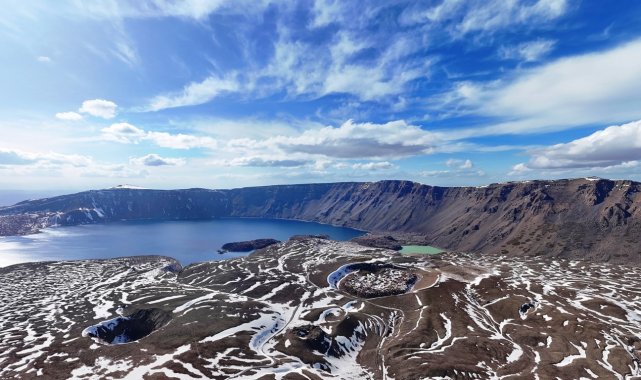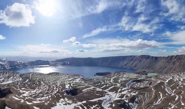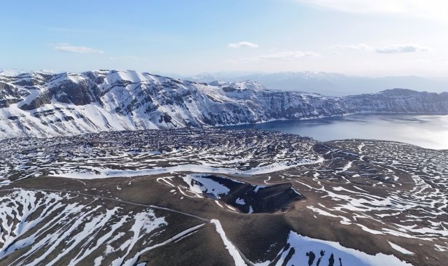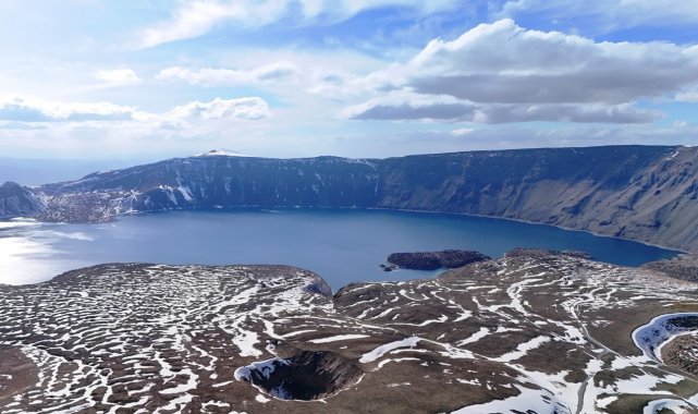 Her yıl binlerce yerli ve yabancı turistin akın ettiği Nemrut Kalderası dört mevsim sunduğu doğal güzelliklerle kendine hayran bırakıyor. Bölgedeki ayı popülasyonunun artması ve son dönemde yaşanan saldırılar sebebiyle valilik kararıyla 1 Kasım 2024 tarihinde ziyarete kapatılan Nemrut Kalderası, yaklaşık 6 aydır ziyarete kapalı durumda. Ziyaret yasağının halen sürdüğü ve ayrıca kardan dolayı yolunun büyük bir bölümünün halen kapalı olduğu kaldera aylar sonra ilk kez havadan görüntülendi. Havadan çekilen görüntülerde, karla kaplı alanların baharın gelişiyle yavaş yavaş eridiği görüldü. Göl yüzeyinin berrak maviliğiyle dikkat çektiği kalderada doğanın muhteşem bir uyum sergilediği görülüyor. Büyük ve küçük göllerin yanı sıra sıcak su kaynaklarıyla bilinen kaldera, gökyüzünden bakıldığında adeta bir sanat eseri gibi görünüyor. Nemrut Krater Gölü'nün masmavi suları ve çevresindeki beyaz örtü ise adeta doğal bir kartpostallık bir manzara sunuyor. Ayrıca güneş ışığının su yüzeyine yansımasıyla gölün muhteşem maviliği, volkanik kayalıklar ve dağların görkemi eşsiz bir doğa harikası oluşturdu. Zaman atlamalı çekim anlamına gelen "timelapse" tekniği ile kaydedilen görüntülerde ise bulutların kaldera üzerinde süzülerek geçişi, doğanın büyüleyici döngüsünü yansıtan görsel bir şölen sundu.
