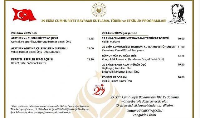 Cumhuriyetin 102. yılı kapsamında kentte yapılacak kutlama, tören ve etkinlik programı Zonguldak Valiliği tarafından duyuruldu.