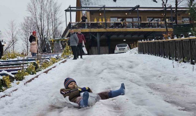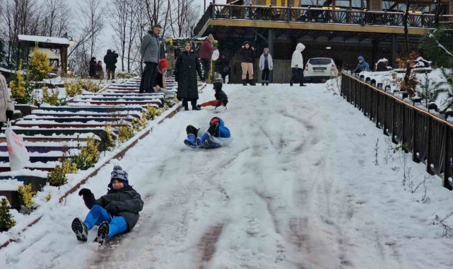 Zonguldak'ta sabah saatlerinden itibaren etkili olan kar yağışı sonrası çocuklar karın tadını kayarak çıkardı.