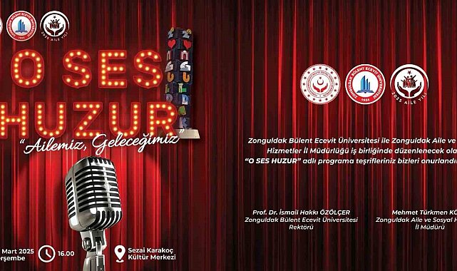 Zonguldak Bülent Ecevit Üniversitesi ile Zonguldak Aile ve Sosyal Hizmetler İl Müdürlüğü iş birliğinde düzenlenecek olan "O Ses Huzur" adlı program, 20 Mart 2025 Perşembe günü saat 16:00'da Sezai Karakoç Kültür Merkezi'nde müzikseverlerle buluşacak. Programda, aile ve sosyal hizmetler alanında farkındalık oluşturmayı hedefleyen çeşitli etkinlikler ve sürprizler yer alacak.