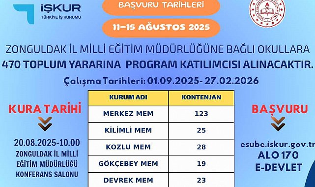 Zonguldak Çalışma ve İş Kurumu İl Müdürlüğü, İl Millî Eğitim Müdürlüğüne bağlı okullarda görevlendirilmek üzere Toplum Yararına Program (TYP) kapsamında 470 katılımcı alınacağını duyurdu.