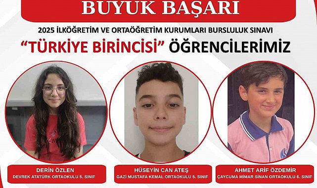 Zonguldak Merkez Gazi Mustafa Kemal Ortaokulu 5. sınıf öğrencisi Hüseyin Can Ateş, Çaycuma Mimar Sinan Ortaokulu 6. sınıf öğrencisi Ahmet Arif Özdemir ve Devrek Atatürk Ortaokulu 5. sınıf öğrencisi Derin Özlen, 2025 yılı Bursluluk Sınavı'nda 500 tam puan alarak Türkiye genelinde birincilik elde etti.