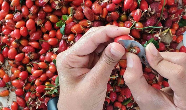 Erzincan'da vatandaşlar doğadan tek tek topladıkları kuşburnuları uzun ve yorucu işlemlerin ardından marmelata dönüştürüyor.