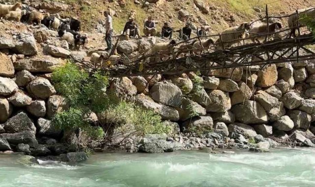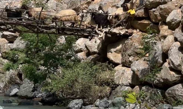 Hakkari'nin Yüksekova ilçesinde bulunan Avaşin Deresi'nin üzerindeki asma köprüden geçen koyun sürüsü, etkileyici görüntüler ortaya çıkardı.