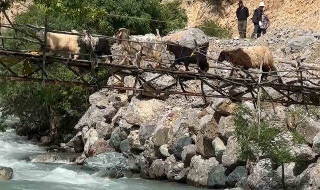Zorlu coğrafyada hayat mücadelesi: Avaşin Deresi'ndeki asma köprüden geçen koyun sürüsü görenleri hayran bıraktı